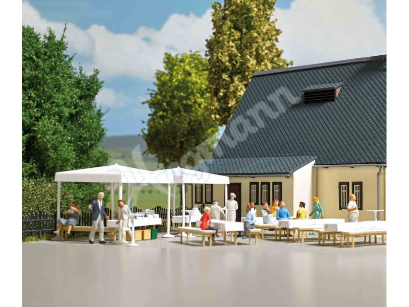 Catering-Set mit Koch (zum selbst Bemalen) und reichhaltigem Zubehör: 2 Marktschirme, 4 Brauereigarnituren bestehend aus 4 Tischen und 8 Bänken, 2 Stehtischen mit Geschirr, 16 Getränkekisten mit Flaschen sowie 3 Wärmebehältern und Torte. Mit Tischdecken zum Ausschneiden. Bausatz.