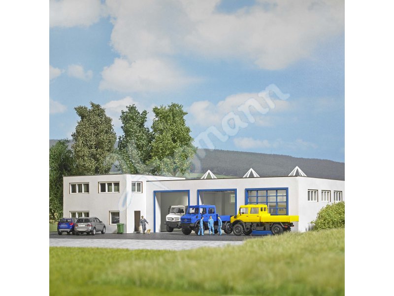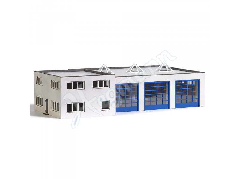 Größe Fahrzeughalle: 200 x 180 mm, 80 mm hoch. Einfahrtiefe: 175 mm. Größe Verwaltungsgebäude: 130 x 105 mm, 70 mm hoch.