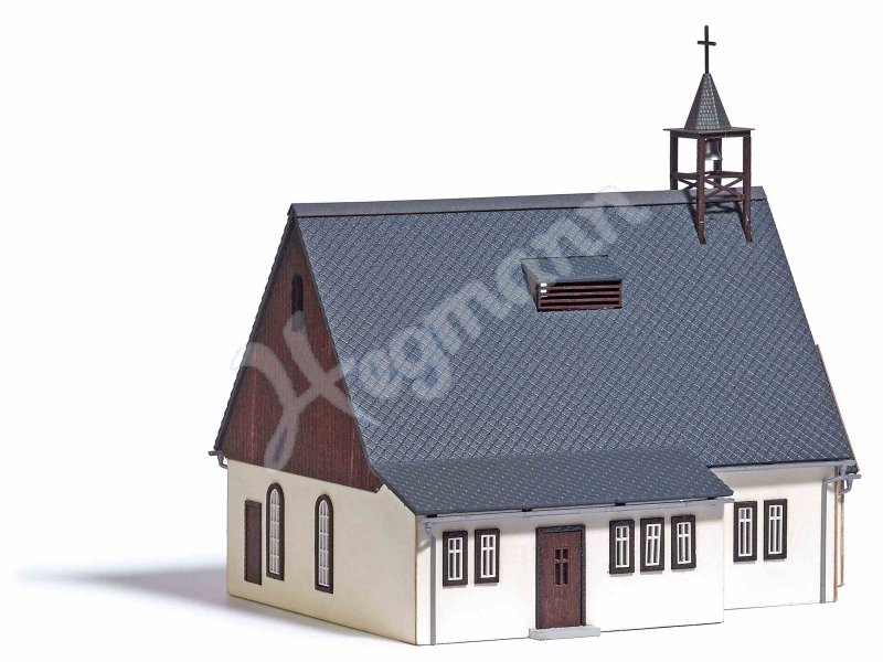 Bausatz für eine Kapelle aus dem Jahr 1929 nach heute noch existierendem Vorbild im Kurort Bad Reiboldsgrün/Vogtland. Türen, Fenster, Dachgauben, Giebelverkleidung und das filigrane Glockentürmchen auf dem Dach bestehen aus echtem Holz. Beleuchtbar mit Busch LEDs 5998.