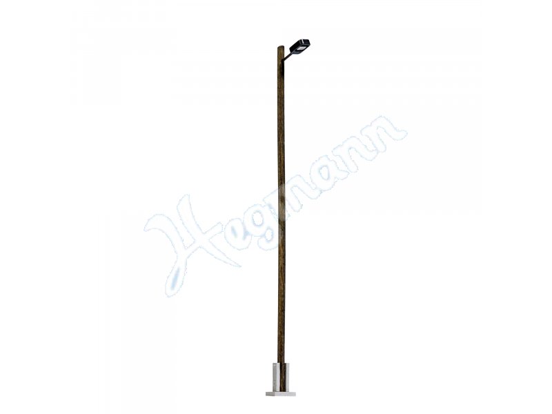 Universell einsetzbare Bahnhofsleuchte mit Mast aus echtem Holz. Auch für Industriegelände geeignet. Nachbildung der Betoneinfassung am Fuß der Lampe.