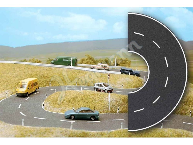 Halbkreis, selbstklebend. Straße 80 mm breit, Durchmesser 230 mm, gleiche Farb- und Materialstruktur wie die Asphaltstraßen. Der Halbkreis kann mit einer Schere z.B. in Viertelkreise bzw. Abschnitten mit beliebigen Winkeln geschnitten werden.
