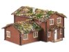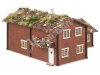 Norwegische Zimmermannsarbeit. Lasercut-Modell eines zweistöckigen Wohnhauses im Blockhüttenstil mit waagerecht geschichteten Balken, einem Vordach am Hauseingang, seitlichem Anbau und Dachbegrünungen mit niedrigwüchsigen Pflanzen, durch die sich das Haus farbenfroh in die Umgebung einfügt.