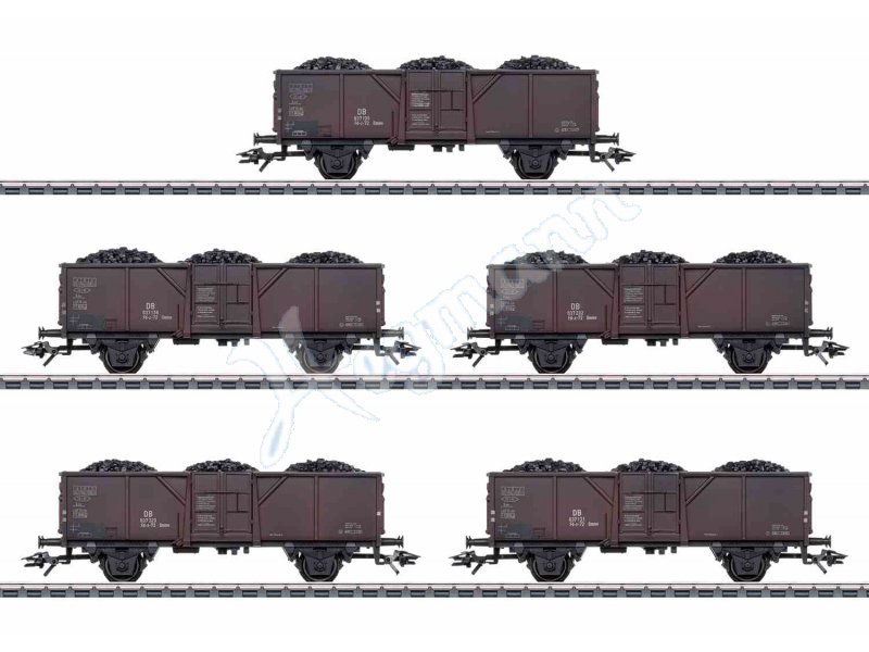 Modelle: Mit angestecktem Kurzkupplungskopf ohne Kulissenführung.Mit betriebsgerechter Alterung.Alle Fünf Wagen mit unterschiedlichen Betriebsnummern.Gleichstromradsatz E700580.