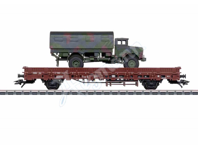Modell: Rungen abnehmbar. Beladen mit einem Modell des MAN 5t 630 L2AE Pritsche/Plane der Deutschen Bundeswehr. Fahrzeughalterungen und einsteckbare Rungen liegen bei. Militärfahrzeug weitgehend aus Metall. Kennzeichen beschriftet. Diverse Ansteckteile aus Kunststoff beiliegend. Modelle des Militärfahrzeugs von Schuco. Länge über Puffer ca. 15,7 cm. Gleichstromradsatz E700580.