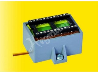 Das kompakte Modul für einfachen Anschluss und helle, flackerfreie LED-Beleuchtung. Die oben auf dem Modul gut zugängliche Steck-Verteilerleiste ermöglicht den bequemen lötfreien Anschluss von 12 Stromverbrauchern durch einfaches Einstecken ihrer Widerstände und Dioden in die Buchsen der Leiste – ideal für die Etageninnenbeleuchtung Art. 6045 – 6048. Mit Zuleitungskabel zum Lichttrafo. Eingangsspannung 16 V AC, Ausgangsspannung ca. 22 V DC, Strom 400 mA dauernd, überlastgeschützt. Die Verteilerleiste ist mit weiteren Verteilerleisten erweiterbar, z. B. Art. 6049. Reicht zur Versorgung von bis zu 25 LED-Leuchten. Maße (ohne Befestigung): L 3,7 x B 2,6 x H 2,2 cm.