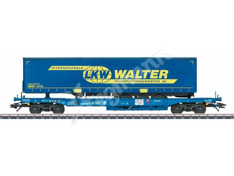 Vorbild: Taschenwagen Bauart Sddkmss der T.R.W. Brüssel, Belgien in verkehrsblauer Grundfarbgebung. Tragwagen zum Transport von Containern, LKW-Wechselaufbauten oder Sattelanhängern. Beladen mit einem Gardinenplanen-Sattelauflieger der Spedition LKW Walter. Betriebszustand ab 2009.
