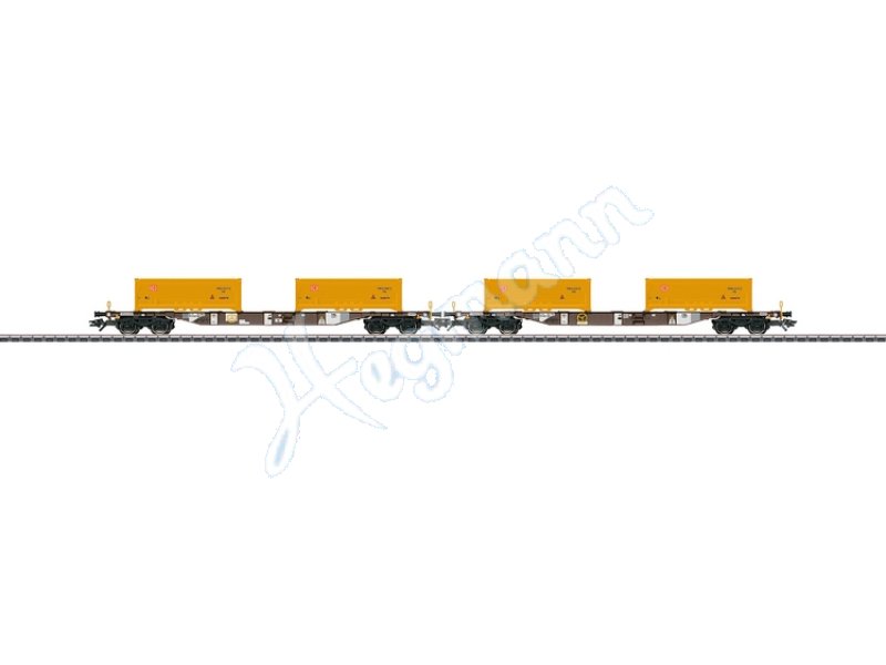 Vorbild: 2 vierachsige Container-Tragwagen Bauart Sgns der AAE. Beladen mit jeweils 2 Mulden mit Erdaushub von Stuttgart 21. Betriebszustand 2014.