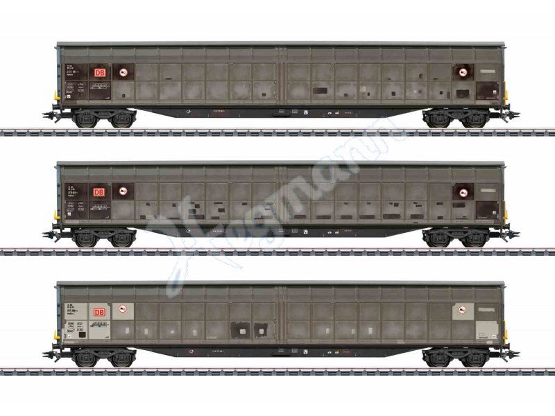 Vorbild: Drei vierachsige Schiebewandwagen Bauart Habbins 354 der DB Cargo, registriert in Deutschland. Ausführung mit außen waagerecht aufgeschweißten Verstärkungen der Schiebewände und ohne Handrad für Feststellbremse. Mit starken Alterungsspuren.