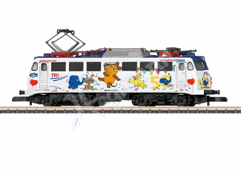 Vorbild: Elektrolokomotive Baureihe 110 der Train Rental GmbH (TRI). Lokkasten mit aerodynamischer Front, der sogenannten Bügelfalte, mit rechteckigen Klatte-Lüftergittern und Maschinenraumfenstern. Betriebsnummer 110 469-4. Betriebszustand ab Januar 2025 in auffälliger Gestaltung als Elefantenexpress.
