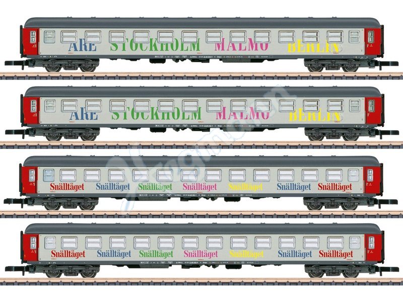 Vorbild: Vier schwedische Abteilwagen Typ Bmpz (2. Klasse), registriert in Österreich. Darstellung des Berlin-Malmö-Express. Beschriftet auf der einen Seite mit Snälltåget und auf der anderen Seite mit den angefahrenen Bahnhöfen (Are, Stockholm, Malmö, Berlin). Aktueller Betriebszustand.