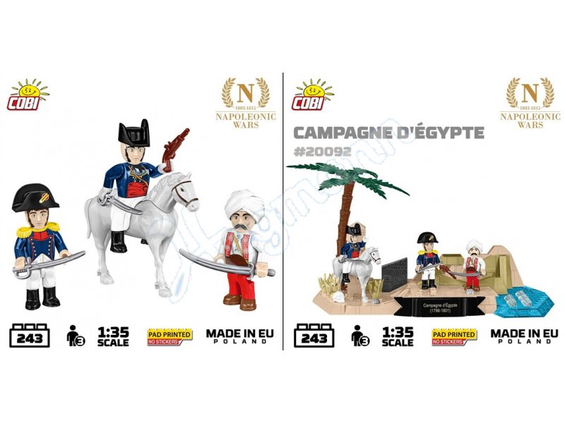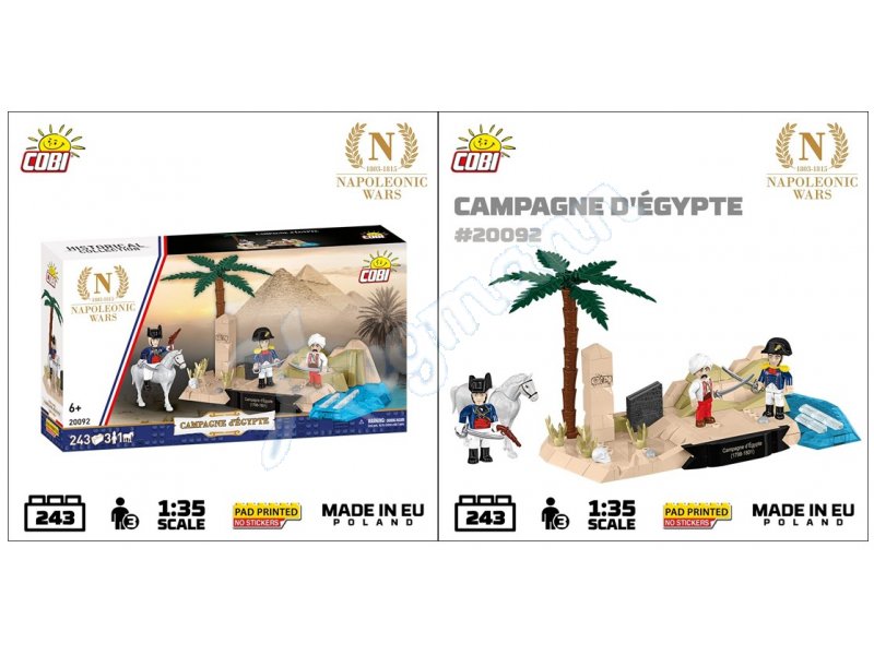 Errichten Sie ein Diorama aus der Zeit von Napoleons Ägyptenfeldzug, als seine Armee kämpfte und das antike Erbe erforschte. Das Set enthält Figuren: Leutnant Bouchard, den Entdecker des Steins von Rosetta, einen Mamelukenkrieger und General Kléber, Napoleons wichtigsten Befehlshaber in Ägypten. Das gedruckte Modell des Rosetta-Steins ist ein einzigartiges Element des Sets. Das Diorama zeigt einen Ausschnitt des Niltals mit einer Palme, Vegetation und einem Wüstenpanorama. Eine dekorative Plakette mit der Inschrift „Campagne d’Égypte 1798–1801“ ergänzt das Set.
