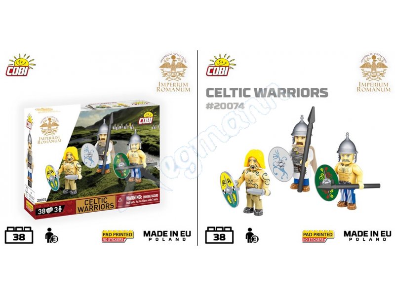 Das Set enthält drei Figuren keltischer Krieger mit völlig neuem Zubehör: Helme, Speere, ein Schwert und Schilde mit einzigartigem Design. Realistische Drucke, historische Details und von authentischen keltischen Waffen inspirierte Elemente versetzen den Baumeister in die Zeit der antiken Schlachten. Dies ist die perfekte Ergänzung zur historischen Sammlung der IMPERIUM ROMANUM-Reihe von COBI. Erlebe den Aufstand gegen das Imperium nach und ziehe in die Schlacht!