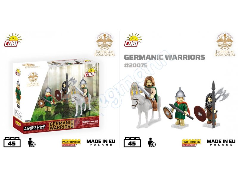 Begib dich in die wilden Wälder Germaniens und stelle ein Team von Kriegern zusammen, die bereit sind, die Macht Roms herauszufordern. Das Set enthält einzigartige Figuren dreier germanischer Krieger mit neuen Aufdrucken sowie eine Pferdefigur, die einem von ihnen als Reittier dient. Das Set enthält detailreiches Zubehör wie Axt, Speere, Schwert, Helm und Schilde – jedes mit einzigartigem Design. Das Set lässt sich perfekt mit anderen Produkten der IMPERIUM ROMANUM-Reihe kombinieren und ermöglicht es dir, deine eigenen Szenarien antiker Schlachten, Hinterhalte und Barbarenüberfälle zu erschaffen.