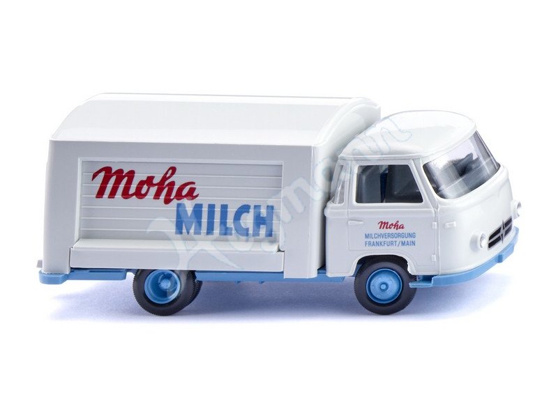 Fahrerhaus, Aufbau und Jalousien papyrusweiß. Inneneinrichtung blaugrau, Fahrgestell und Kardanteil babyblau. Milchflascheneinsatz papyrusweiß. Felgen babyblau. Seitlich karminroter ämoha“-Aufdruck und babyblauer äMilch“-Schriftzug. Auf den Fahrerhaustüren karminroter ämoha“-Schriftzug und babyblauer Hinweis äMilchversorgung Frankfurt/Main“. Rücklichter karminrot bedruckt, Scheinwerfer vorn per Hand gesilbert. Kühlergrill schwarz mit silbernem Zierrat und Borgward-Rhombus.