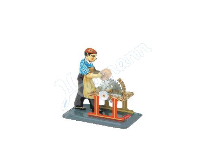 Arbeiter mit Holzklotz an der Kreissäge. Fein lackiertes und bedrucktes Blech.