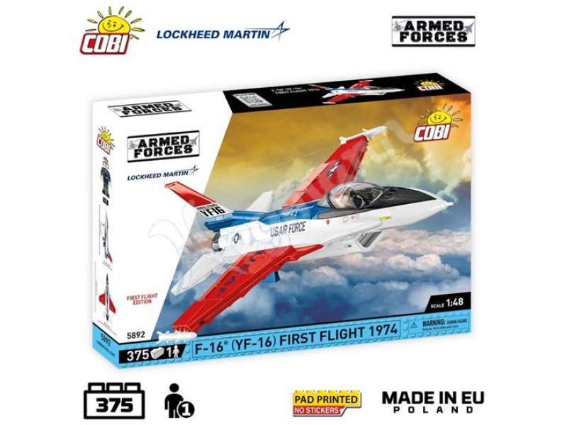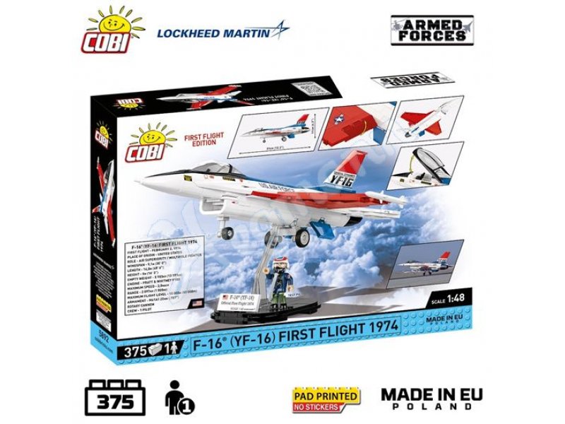 F-16 (YF-16) Erstflug 1974 – eine einzigartige Ausgabe des legendären Flugzeugs, das seit 50 Jahren den Luftraum von Dutzenden Ländern auf der ganzen Welt verteidigt. Der Erstflug fand am 2. Februar 1974 statt. Aus 375 COBI-Bausteinen höchster Qualität bauen Sie das beliebteste Kampf- und Verteidigungsflugzeug F-16® FIGHTING FALCON® in den Farben seines Erstflugs im Jahr 1974, lizenziert vom Verteidigungsgiganten Lockheed Martin! Das Set wurde sorgfältig im Modellmaßstab 1:48 entworfen. Die Klemmbausteine sind mit hochwertigen Drucken beklebt. Das Set enthält eine Testpilotenfigur in charakteristischer Uniform und einen Präsentationsständer.