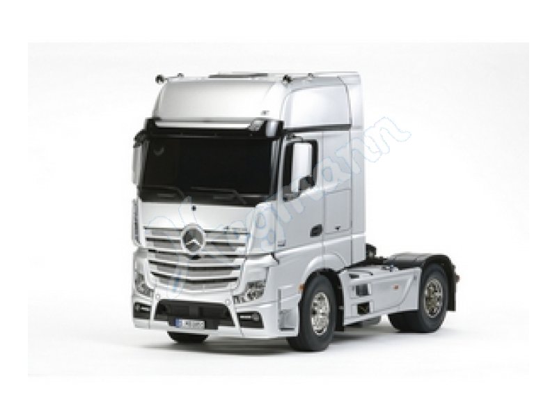 Art.Nr.: 300056335 Artikelbezeichnung: 1:14 RC Mercedes Benz Actros 1851 GigaSpace, , Truck of the Year 2012, , Der TAMIYA Mercedes-Benz Actros 1851 GigaSpace ist eine perfekte Nachbildung des Truck of the Year 2012. Das Modell im Maßstab 1:14 zeigt die Hochdachausführung der 510 PS starken Topversion, des weltgrößten LKW-Herstellers. Verchromte Bauteile, wie der mächtige Mercedesstern, verleihen dem 458 mm langen und rund 3 kg schweren Bausatz ihr vorbildgetreues Aussehen. Besonders auffällig am neusten Zuwachs, in TAMIYAs unübertroffener LKW-Serie, sind die beleuchtbaren Positionslampen, verchromte Fanfaren und serienmäßige Breitreifen. Weitere neue Details wie zwei zusätzliche Tote-Winkel-Spiegel und die fein nachgebildeten Kraftstofftanks prägen das vorbildgetreue Aussehen. Dank seines kräftigen Elektromotors, der sein Drehmoment über ein schaltbares 3-Gang-Schaltgetriebe an die Hinterachse abgibt, lassen sich beeindruckende Gespanne zusammenstellen. Die vorbildgetreue Sattelplatte des ferngesteuerten Modells erlaubt das Koppeln mit zahlreichen TAMIYA und CARSON-MODEL SPORT Aufliegern. Mit der optional erhältlichen Multifunktionseinheit simuliert der TAMIYA Mercedes-Benz Actros nahezu alle Sound- und Lichtfunktionen seines großen Vorbildes, dem König der Straßen., , Technische Daten: Länge 458 mm Breite 195 mm Höhe 305 mm Gewicht ca. 3000 g